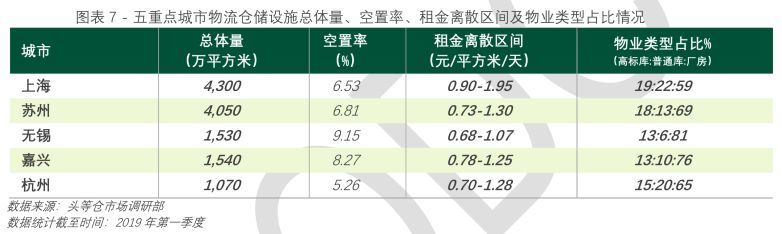 (长三角核心5城的仓库供应、市场数据及类型比例)