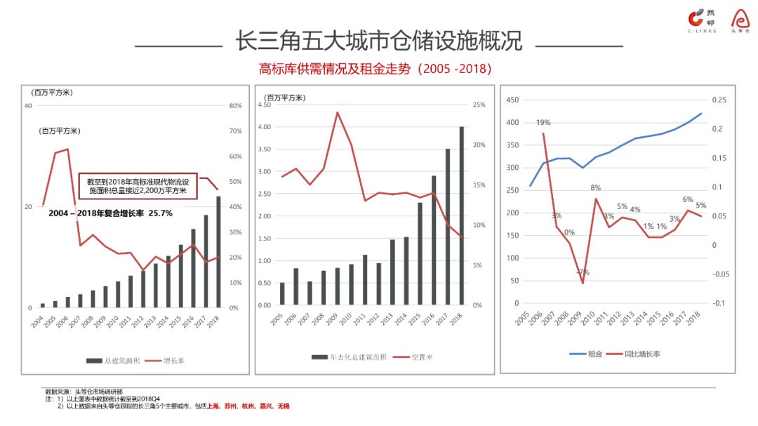 整个长三角地区以上海为源头的仓储设施的布局以向北以及向南两个方向延伸为主。