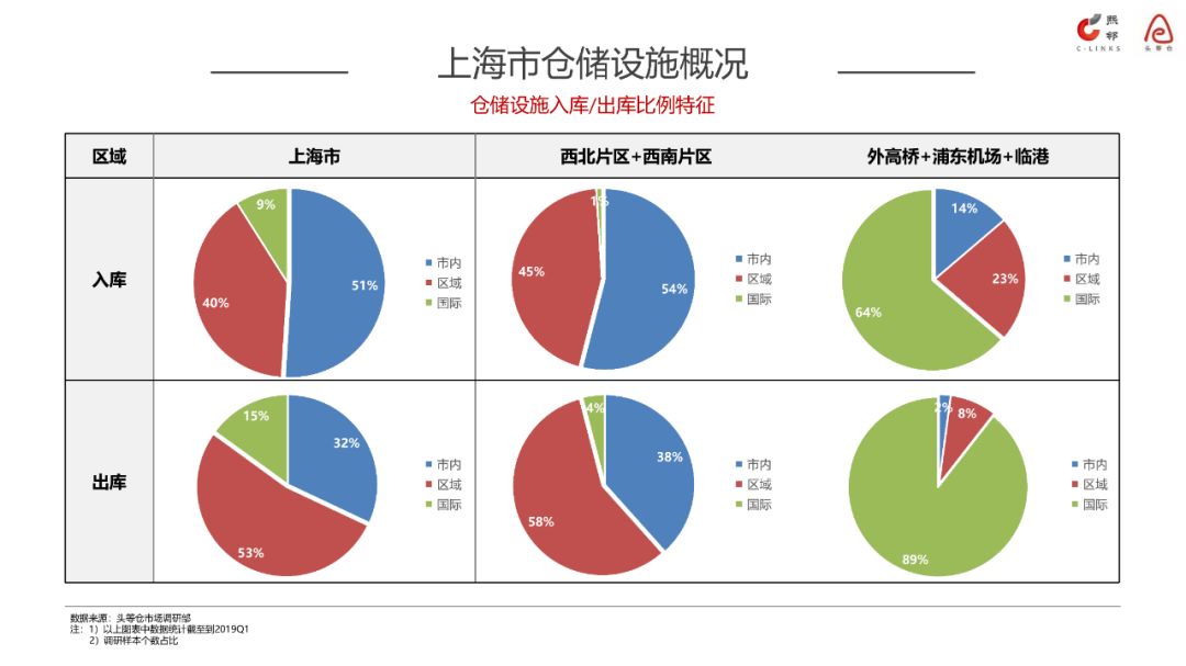 对这五大块区域的仓储物流配送模式调研分析后,头等仓发现,就上海全市范围样本统计,51%的入库货物来自于市内,约40%是从外省市来。从出库的角度分析,53%的货物是外省市配送的。