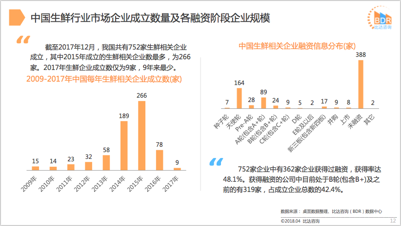 截至2017年12月,我国共有752家生鲜相关企业成立,其中2015年成立的生鲜相关企业数最多,为266家。2017年生鲜企业成立数仅为9家,9年来最少。