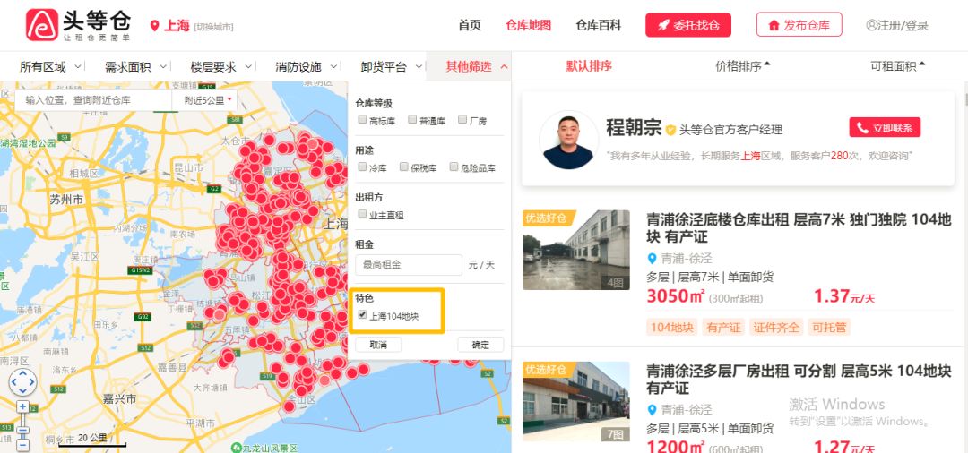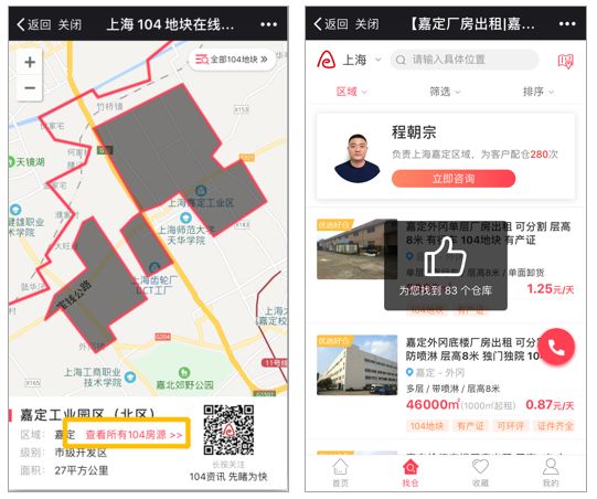 秉持“让租仓更简单!”的服务宗旨,头等仓将104地块内的优质仓库资源与“上海工业地产104地块在线地图”整合,点击目标地块则可查看该范围内所有仓库位置、规格、报价等详情,实现精确房源、一键找库的便捷操作。