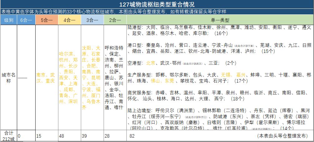 头等仓整理的127个城市物流枢纽类型重合情况如下: