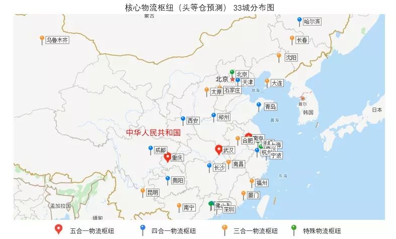 南京、武汉、重庆、哈尔滨、杭州、郑州、长沙、贵阳、西安、天津、上海、成都、青岛、广州、深圳、沈阳、太原、石家庄、长春、合肥、南昌、南宁、昆明、大连、宁波、福州、厦门、乌鲁木齐,以及虽然仅有单一类型但目前物流发展势态良好的北京、无锡、嘉兴、佛山、东莞这33个城市。