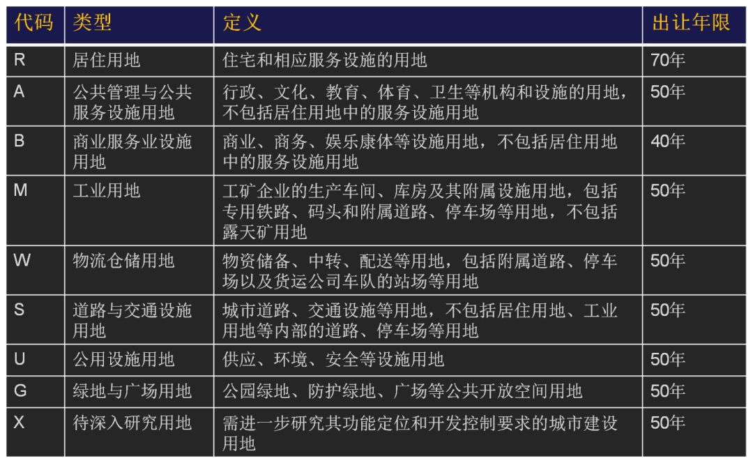 但是严格来说,随着管理的精细化及土地类型发展的多样化,为了更好地区分不同土地的用途,在现行的土地相关的管理文件中,将城市建设用地划分出9大类、36中类、47小类。根据我国《城镇国有土地使用权出让和转让暂行条例》第12条规定,具体9大分类及土地使用权出让年限如下: