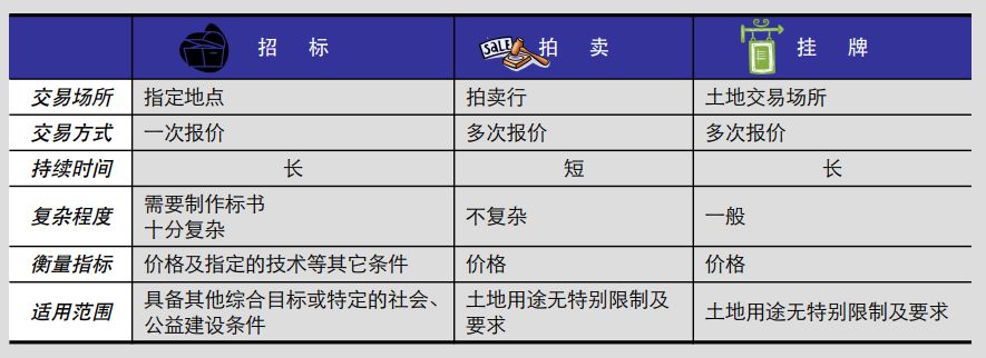 下图为招标、拍卖、挂牌三种出让形式的适用范围及区别:
