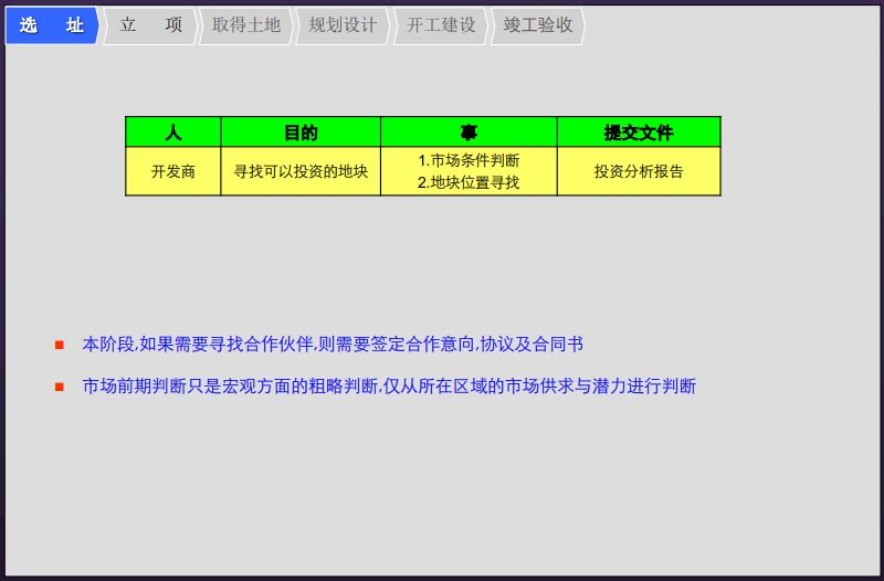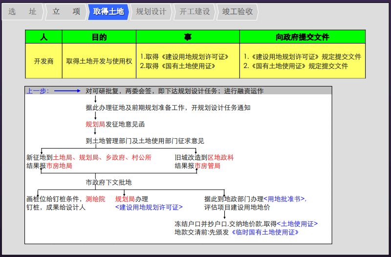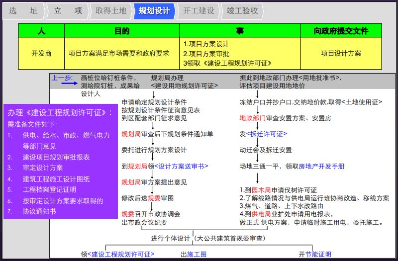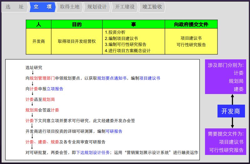 3、开发房地产项目的流程可分为6个环节:选址→立项→取得土地→规划设计→开工建设→竣工验收。具体每个环节涉及到的人、事、物如下图所示:(文末可下载完整PPT)
